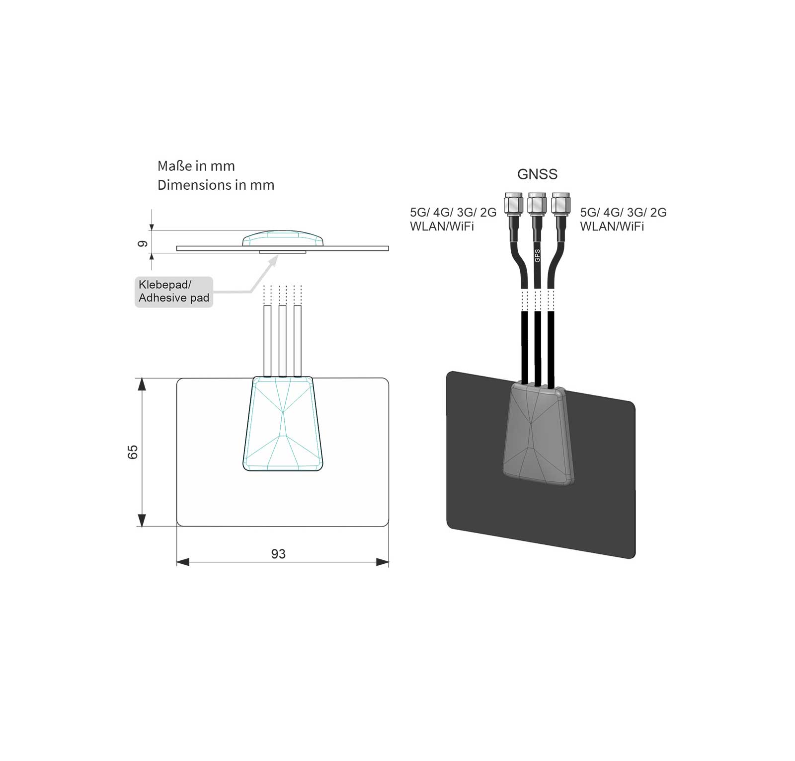 Gewinn: 2 G / 3G / 4G / 5G: 2 .. 5 dBi; WLAN 5 .. 6 dBi; GNSS: 25 dBic typ.