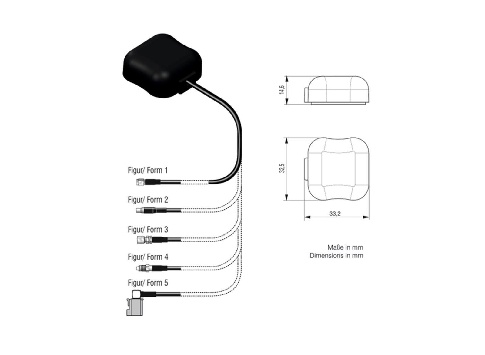 Magnet- und Klebeantenne für den GPS-Empfang im Fahrzeuginnenraum bzw. im Außenbereich mit folgenden Eigenschaften: