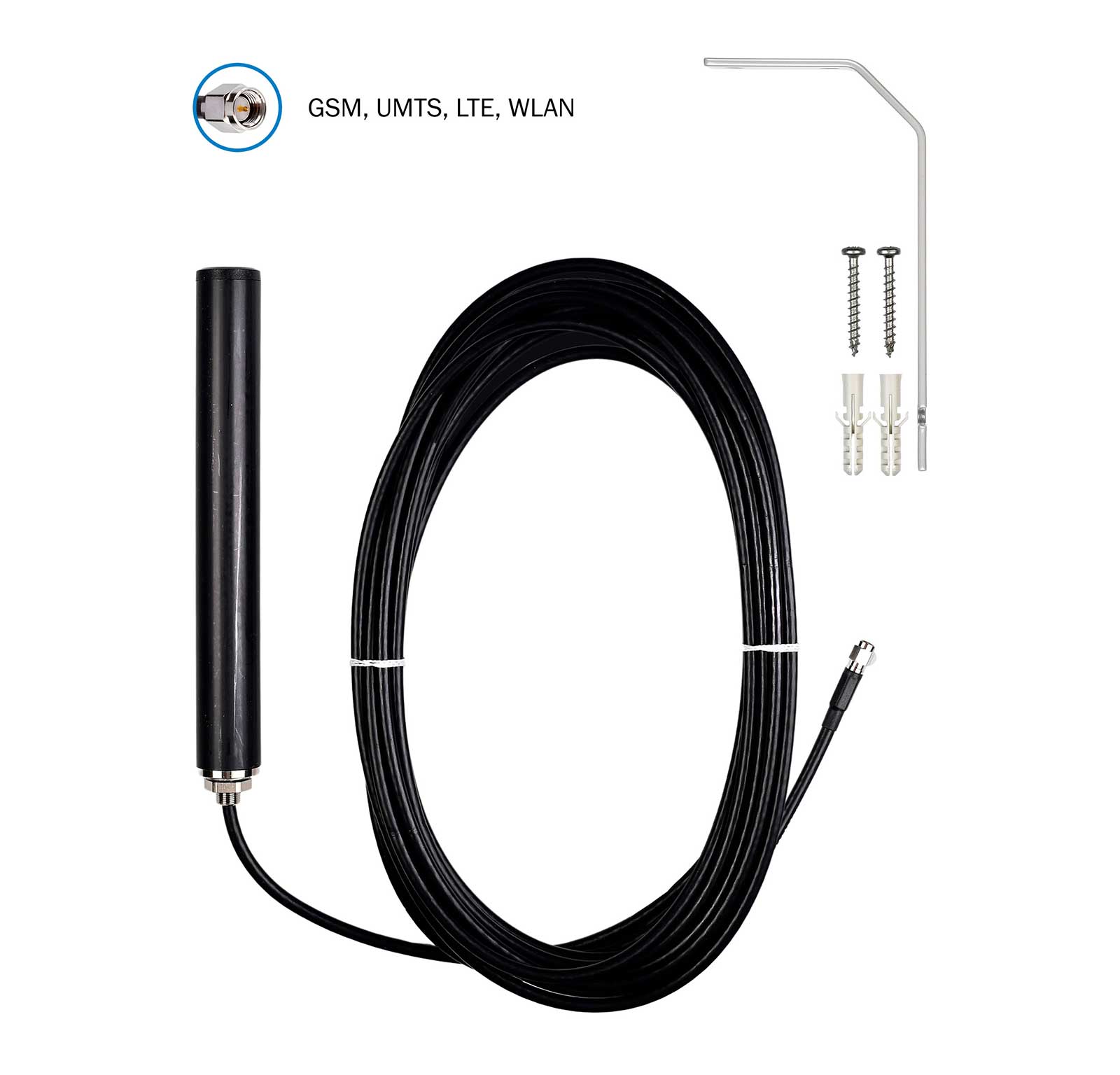 Die ATTB 4934.11 Multibandantenne deckt mehrere Frequenzbänder und damit Kommunikationsdienste ab. Darunter GSM (2G), UMTS (3G), LTE (4G), 5G, 868 MHz (LoRa), Bluetooth und WLAN.