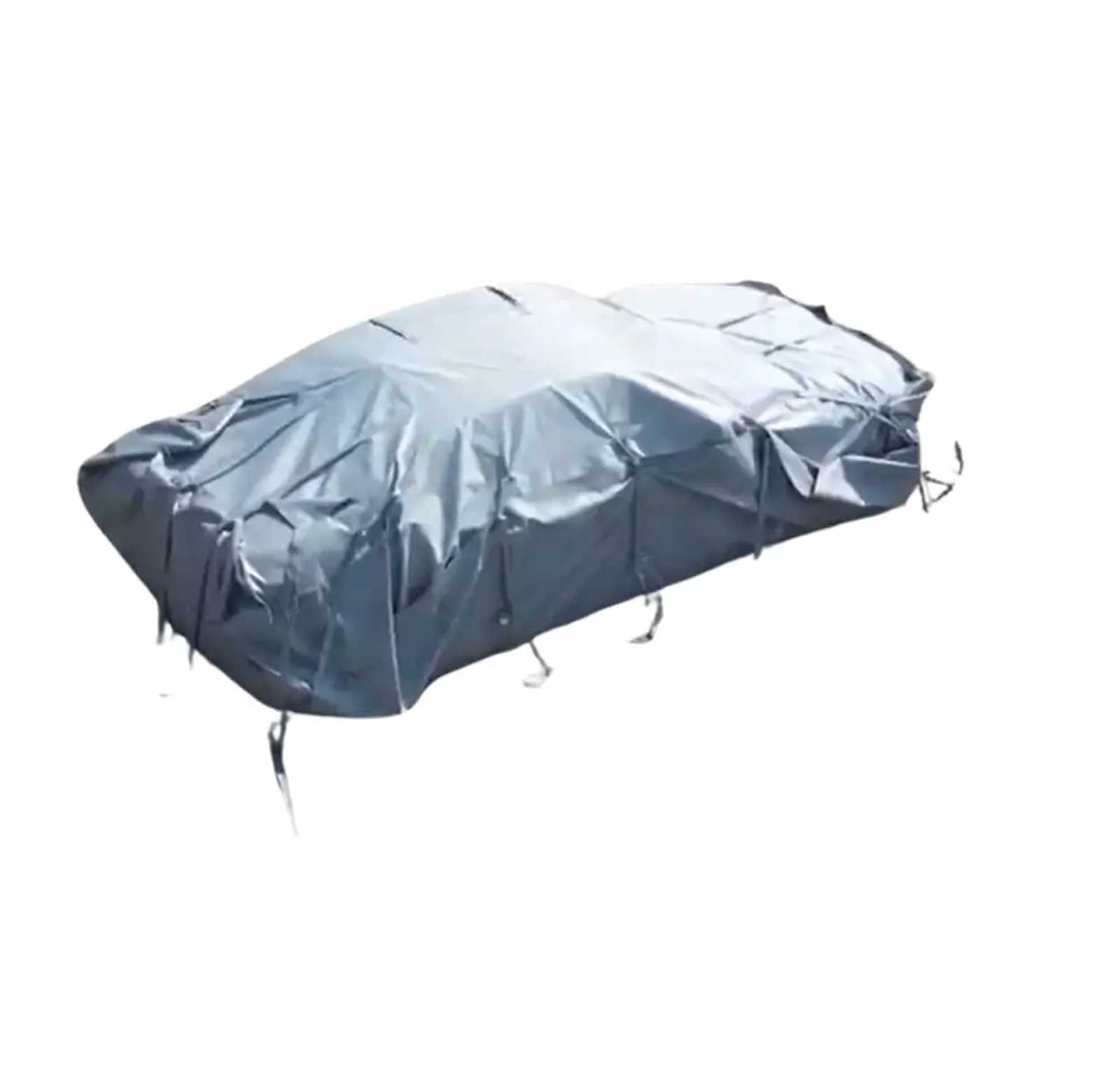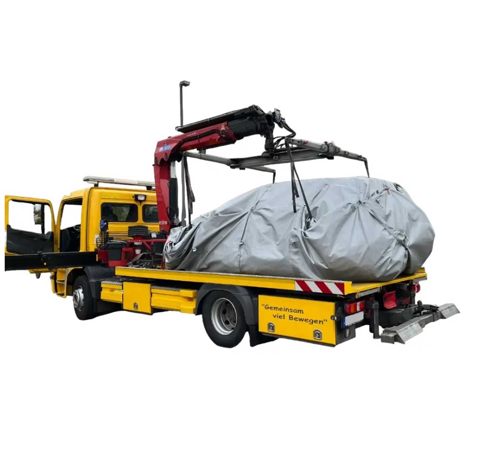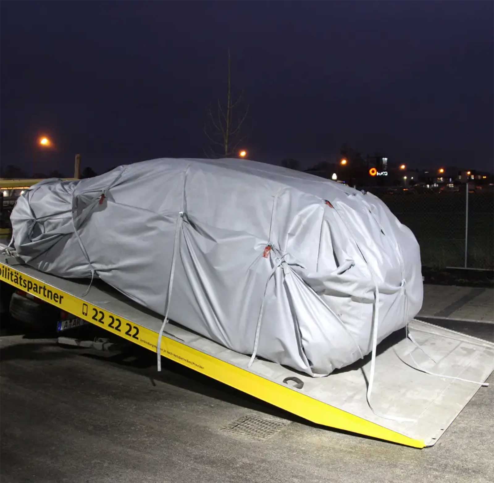 Präventiv wird ein verunfalltes E-Auto in die silikonbeschichteten Glasfaserdecken verpackt und verzurrt. Entzündet sich der Akku, so bleibt die Umgebung geschützt und das Feuer kann sich nicht ausbreiten.