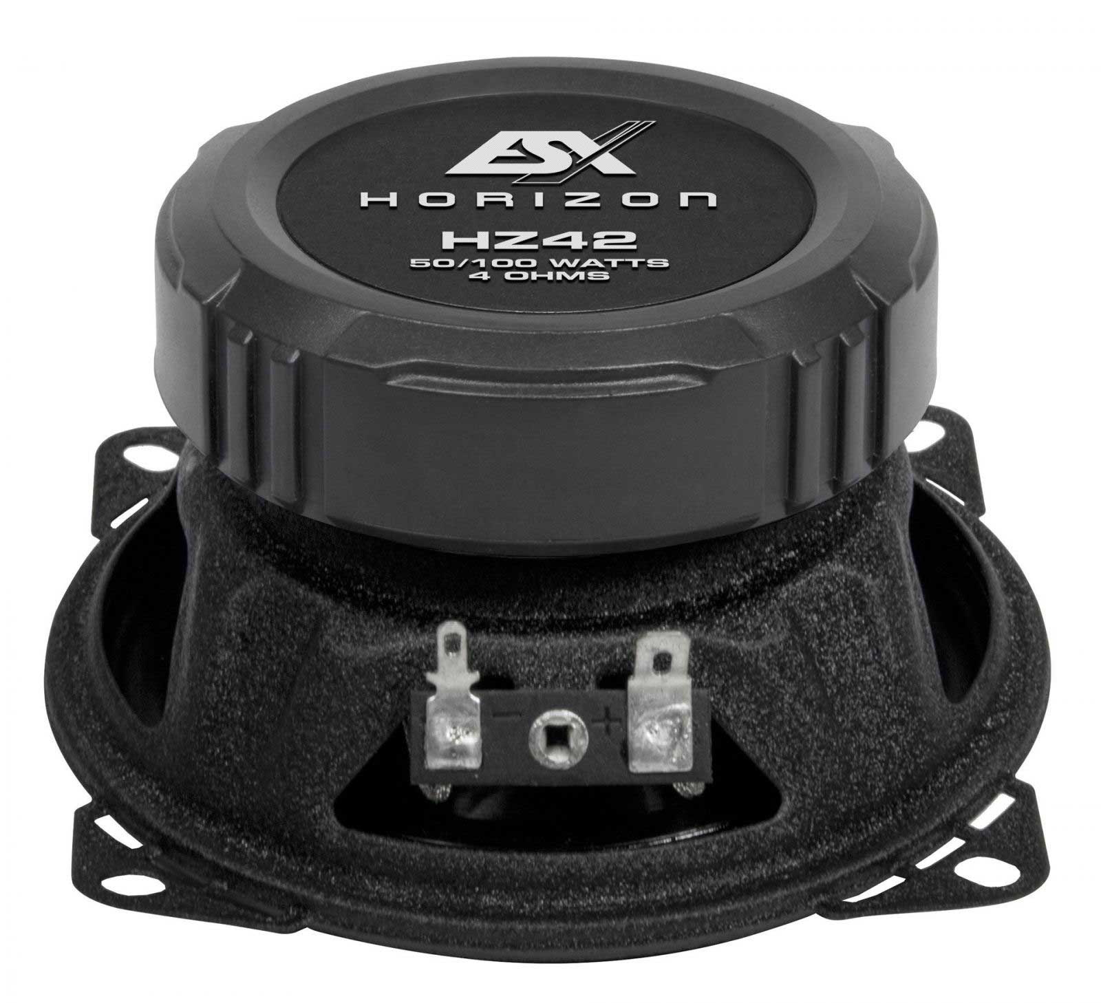 Die HORIZON Lautsprecher-Serie von ESX bietet in puncto Preis/Leistung ein optimales Verhältnis und setzt die Messlatte in dieser Preisklasse enorm hoch. HZ-Lautsprecher stehen für Qualität, Design und Performance gleichermaßen. Zur Verwendung kommt eine ultrasteife Polypropylen-Membran, die auch bei dauerhaft hohen Pegeln für akkurate und saubere Auslenkungen sorgt. Der kräftige Magnetantrieb der Lautsprecher ist mit einem starken Rubberboot optimal geschützt und sitzt stabil auf einem verstärkten resonanzarmen Stahlkorb. Edel dezente Schutzgitter runden jedes System perfekt ab. Die HORIZON Komponenten-Systeme und großen Koax/Triax-Modelle besitzen dank ihrer effizienten 3 Ohm-Schwingspule einen sehr hohen Wirkungsgrad. Dies bedeutet, dass selbst mit geringen Ausgangsleistungen eine sehr gute Klangperformance und hohe Lautstärke erreicht wird. Die bei den Systemen beiliegenden kompakten 12dB Kabelweichen finden überall ein Plätzchen und sind mit Hochtonschutz samt einer Pegelanpassung für den Hochton ausgestattet.