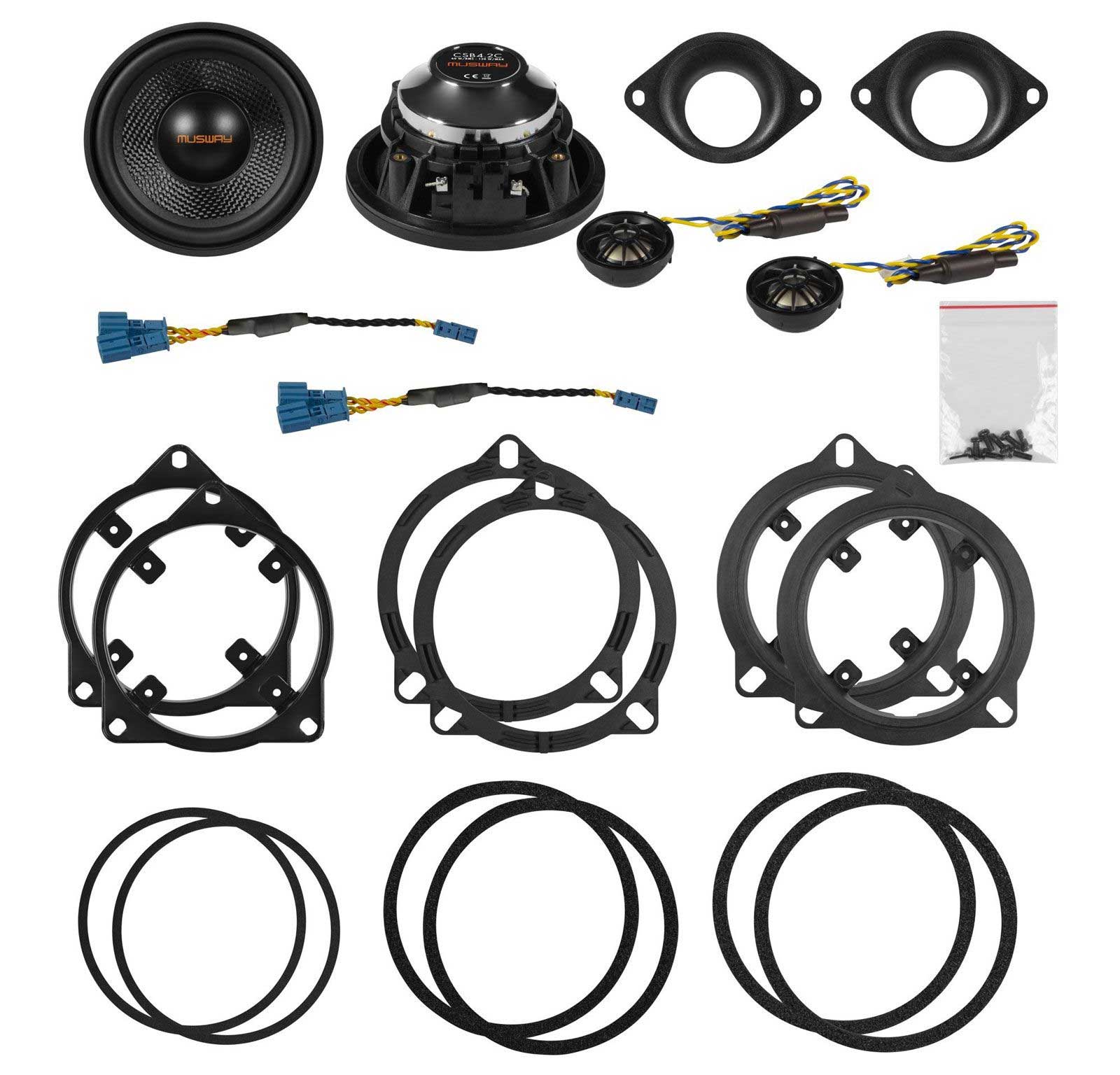Wer seinem BMW Fahrzeug diese Neuentwicklungen verordnet, der darf sich über deutlich besseren Klang in Verbindung mit höherer Belastbarkeit freuen und wird sich gerne vom Ab-Werk-Sound zu verabschieden! Alle Modelle sind mit einer stabilen aber ultraleichten Glasfaser-Membran ausgestattet und besitzen einen Dual-Neodym-Antrieb mit solidem N42H-Magneten. Dies ermöglicht schon bei geringer Verstärkerleistung eine optimale Klangausbeute. Der CSB8W Subwoofer ist sogar mit einer 50 mm CCAW-Schwingspule ausgestattet, welche sehr leicht ist und dadurch einen erstaunlich guten Wirkungsgrad von 89 dB/W/m erreicht. Der 25 mm Hochtöner des Komponenten-Systems CSB4.2C besitzt eine überaus wertigen Titan-Membran und ebenfalls einen kräftigen Neodym-Magnet Antrieb. Beides gewährleistet einen linearen Frequenzgang bis über 20 kHz und eine fantastische Hochton-Auflösung. Alle Modelle haben fahrzeugspezifische Anschlüsse für die einfache Montage.