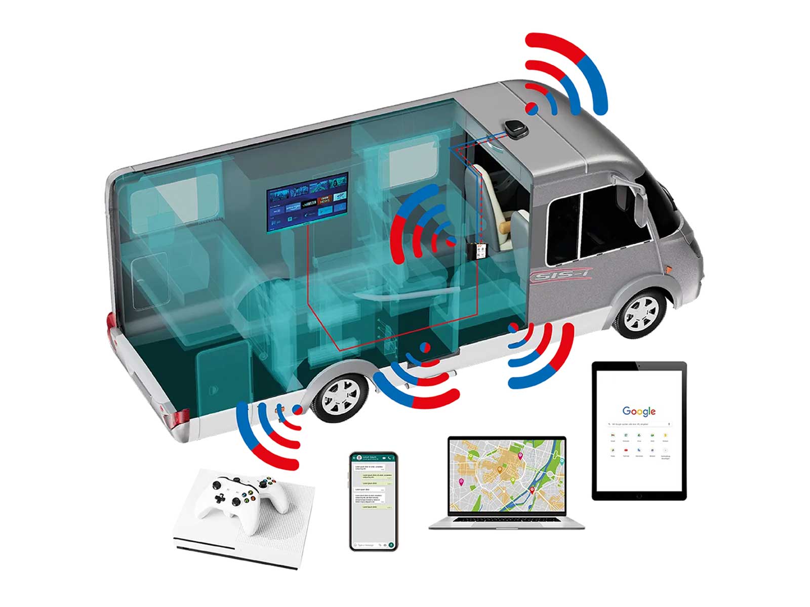 Das Herzstück ist dabei ein Internet Router, der z. B. über das 12 Volt Bordnetz betreiben werden kann, und der ein eingehendes WLAN-Signal, oder dank einer eingelegten SIM-Karte ein Mobilfunknetz-Signal von außen empfangen und im Inneren des Wohnmobils oder Wohnwagens als privates, passwortgeschütztes WLAN-Signal aussenden kann. Dadurch haben Sie im Inneren ein deutlich besseres Signal, als Sie es direkt mit Ihrem Smartphone, Tablet, Laptop oder TV hätten. Darüber hinaus können Sie mehrere Geräte gleichzeitig mit dem Internet Router verbinden. Dieser hat keine SIM-Sperre und kann mit den Auflade-SIM-Karten (Prepaid) oder Vertrags-SIM-Karten (Postpaid) der verschiedenen Anbieter verwendet werden. Da er über 2 SIM-Karteneinschübe verfügt, können z. B. im Ausland auch ausländische SIM-Karten zusätzlich verwendet werden. Für einen guten Empfang sorgt eine Außenantenne, die auf dem Camper oder Caravan montiert, und mit dem Internet Router im Inneren verbunden wird.