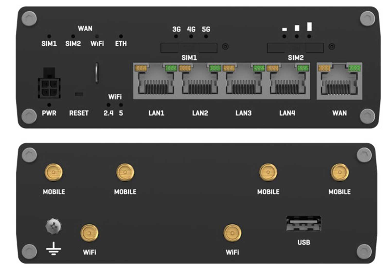 Antennenanschlüsse: 4 x SMA für Mobile, 2 x RP-SMA für WiFi, 1 x SMA für GNSS