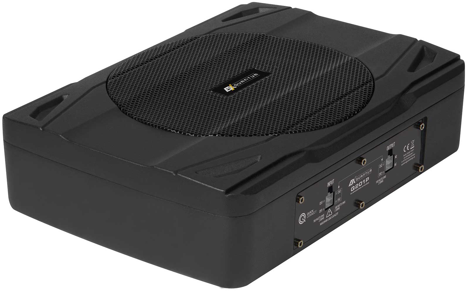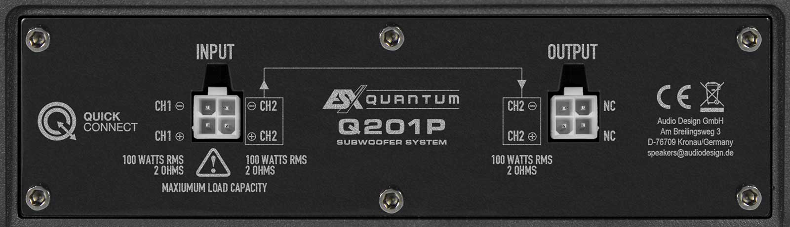Das QUANTUM Q201P Subwoofer-System ist wie die aktive Version Q201A eine mehr als perfekte Bass-Lösung, wenn im Fahrzeug kein Platz für größere Subwoofer-Boxen ist. Das kompakte und zugleich robuste Voll-Aluminium-Gehäuse findet überall im Fahrzeug seinen Platz. Wer noch mehr Bass-Performance haben möchte, kann sein System so konfigurieren, dass er gleich mit zwei Subwoofern plant. Für diesen Zweck befindet sich am Q201P ein spezieller Quick Connect Ausgang, an den das zweite Subwoofer-System schnell und einfach angeschlossen werden kann. Vorzugsweise sollte ein ESX Subwoofer-System mit Quick Connect Anschluss gewählt werden, da hierfür bereits alles vorkonfiguriert wurde.