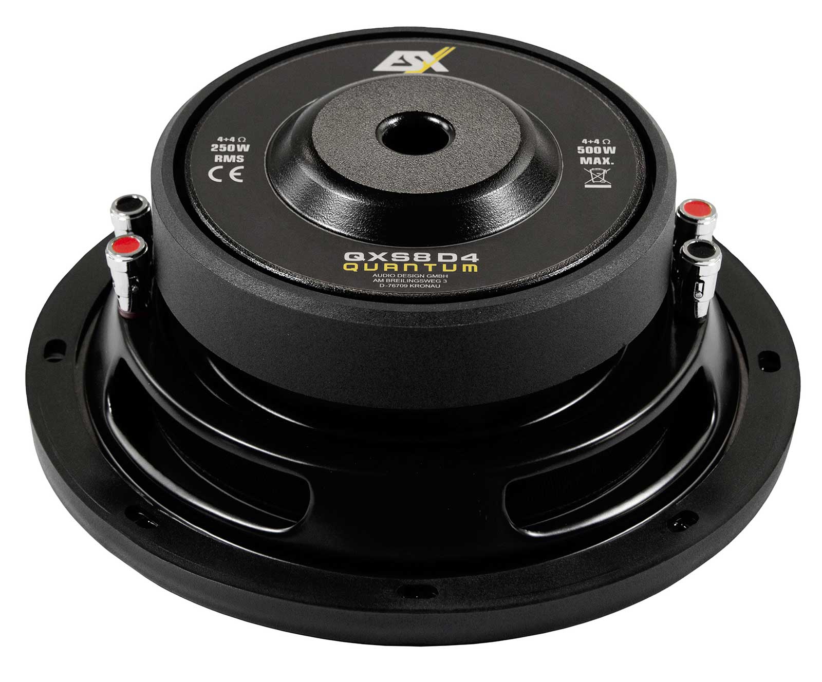 Mit 78 mm Einbautiefe ist dieser Subwoofer der ideale Problemlöser für Spezialeinbauten. Ein besonders flacher Subwoofer sollte natürlich auch gut klingen und muss robust sein. Daher setzt ESX QUANTUM QXS Subwoofer spezielle und sehr harte Membranen aus den Verbundstoffen Glasfaser und Karbon ein. Der Tieftöner besitzt einen 40 Unzen schweren Magnet und wird von einer 50 mm großen 4+4 Ohm Doppelschwingspulen angetrieben, welche sehr lang gewickelt sind.