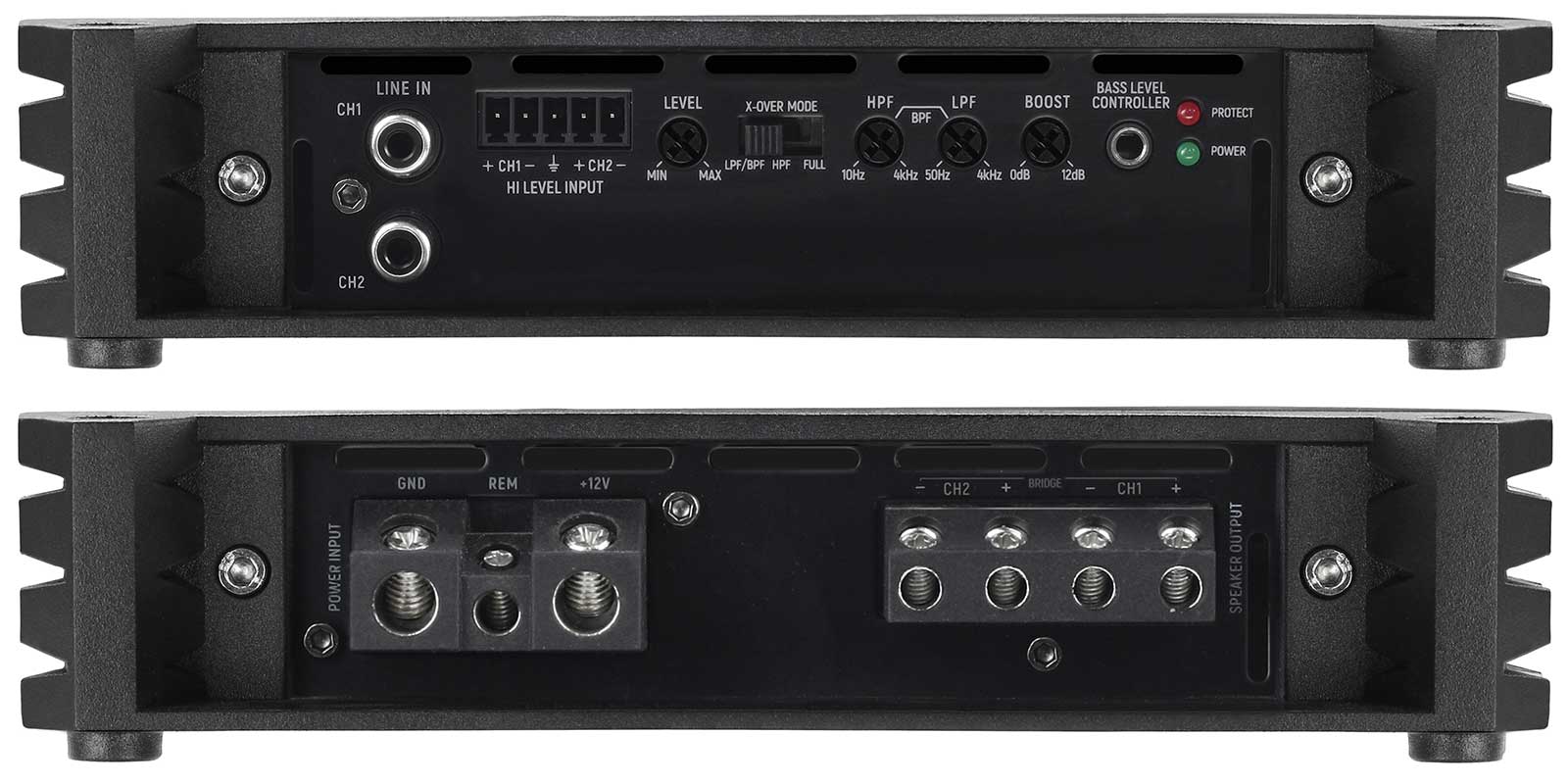 - 2 x 150/250 W/Max. @ 4/2 Ohm oder 1 x 500 W/RMS. @ 4 Ohm gebrückt