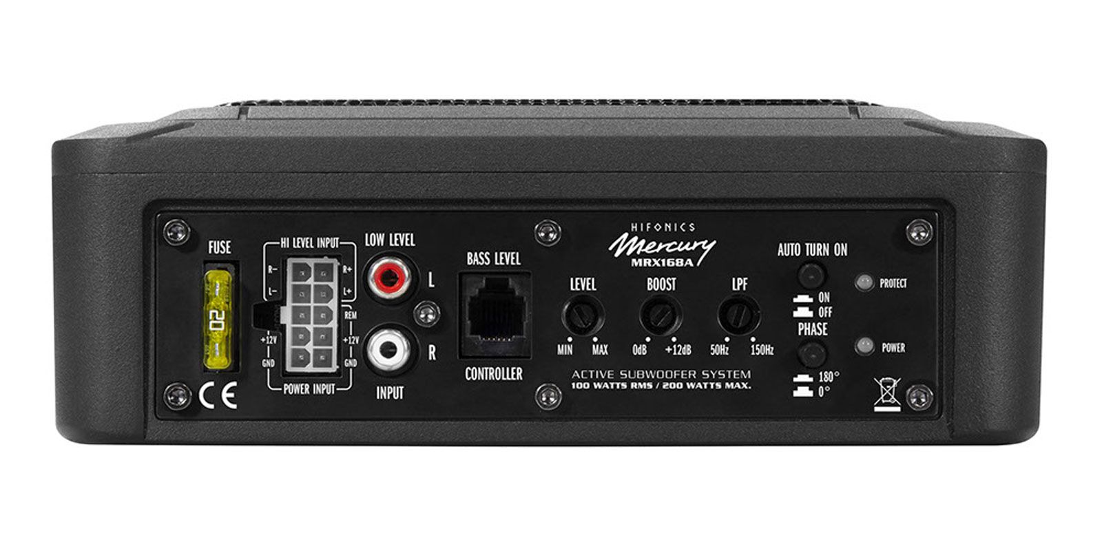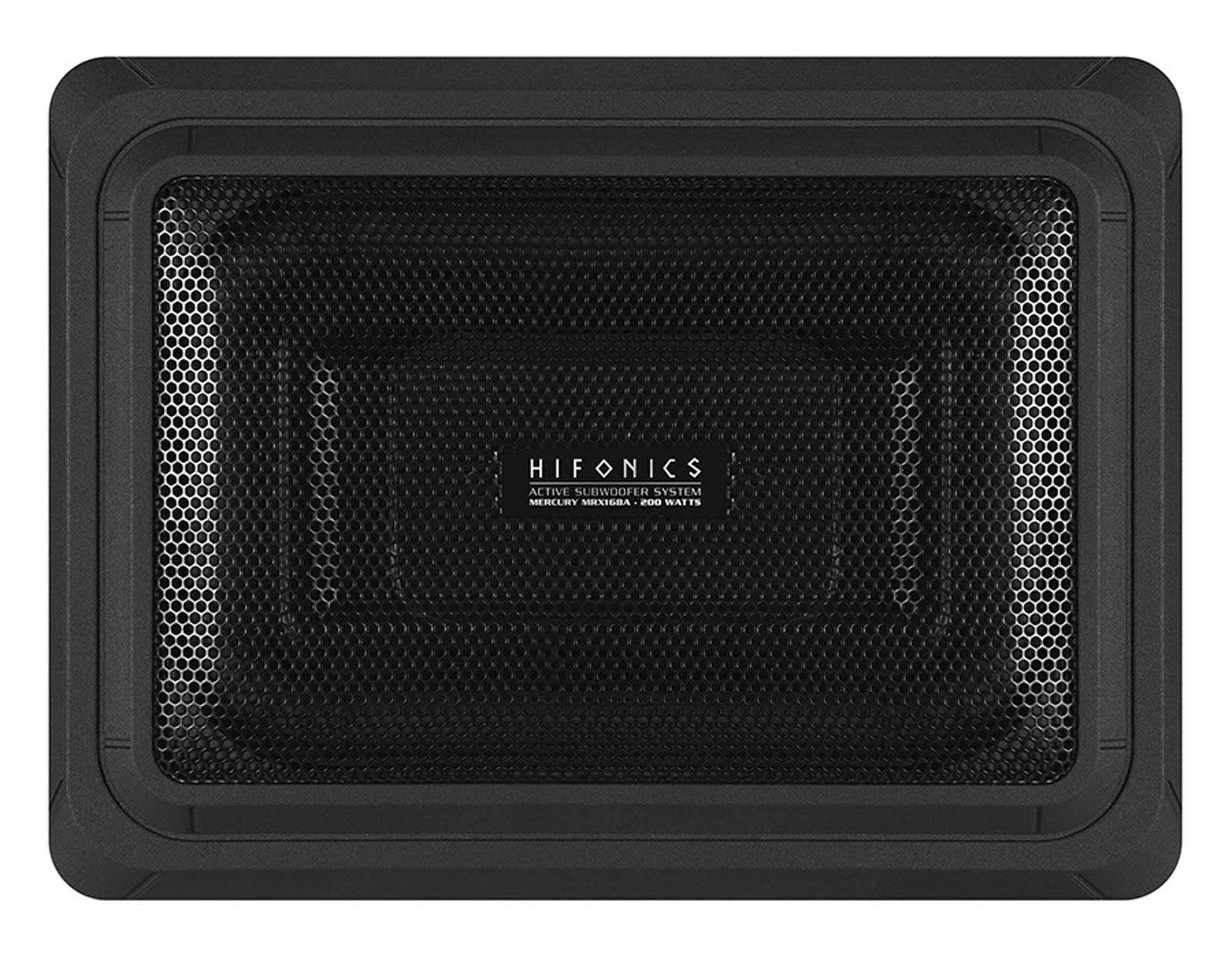 Der MERCURY MRX168A Untersitz-Aktiv-Subwoofer mit den Abmessungen 26 x 19,5 cm unterbietet herkömmliche Subwoofer-Systeme dieser Art um einige Zentimeter. Was das kleine Aktiv-System an druckvollem Bass erzeugt, verblüfft garantiert jeden Zuhörer. In solch kleinen Gehäusen herrscht im Betrieb ein sehr hoher Druck; handelsübliche Membranen würden daher zerstört werden. Aus diesem Grund kommt im MRX168A eine spezielle Aluminium-Membran in Ovalformat zum Einsatz, die selbst höchsten Drücken standhalten kann. Gar nicht klein ist der eingesetzte Class AB-Verstärker. Mit gut 100 Watt RMS hat er den verbauten Alucone-Woofer mit einer 36 mm Schwingspule und kräftigem Antrieb perfekt im Griff. Durch den kurzschlussfesten 10-Pin Stecker kann das Aktiv-System bei Bedarf auch mal ganz schnell und einfach ausgebaut werden.