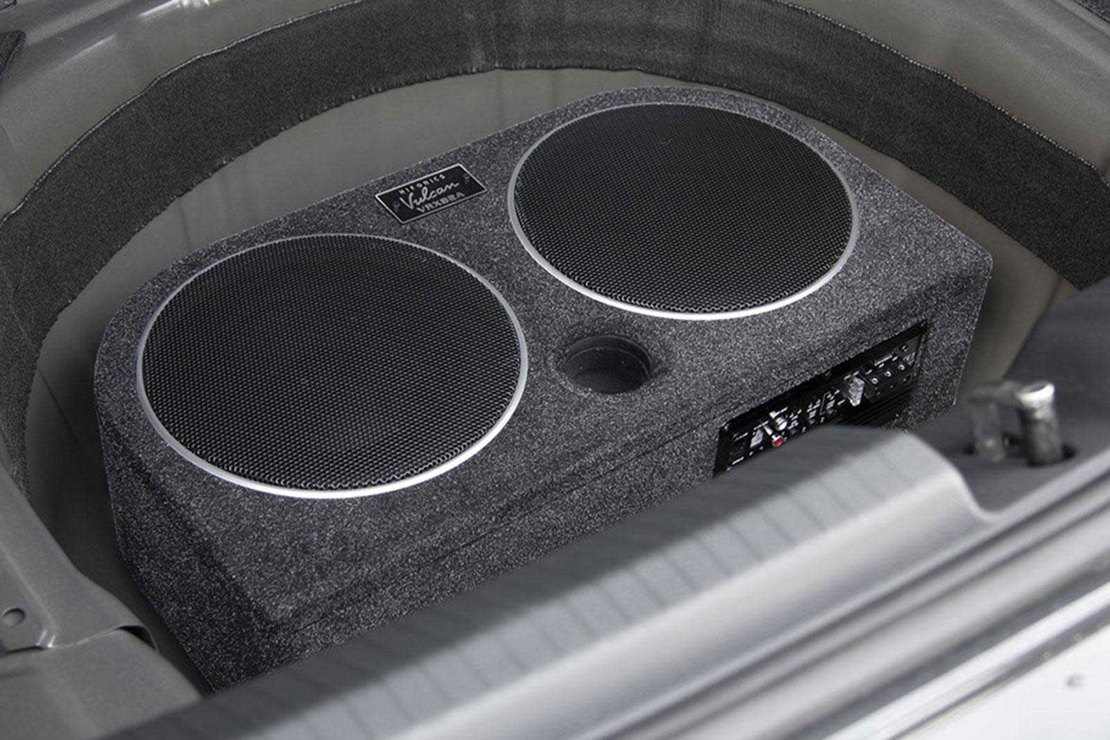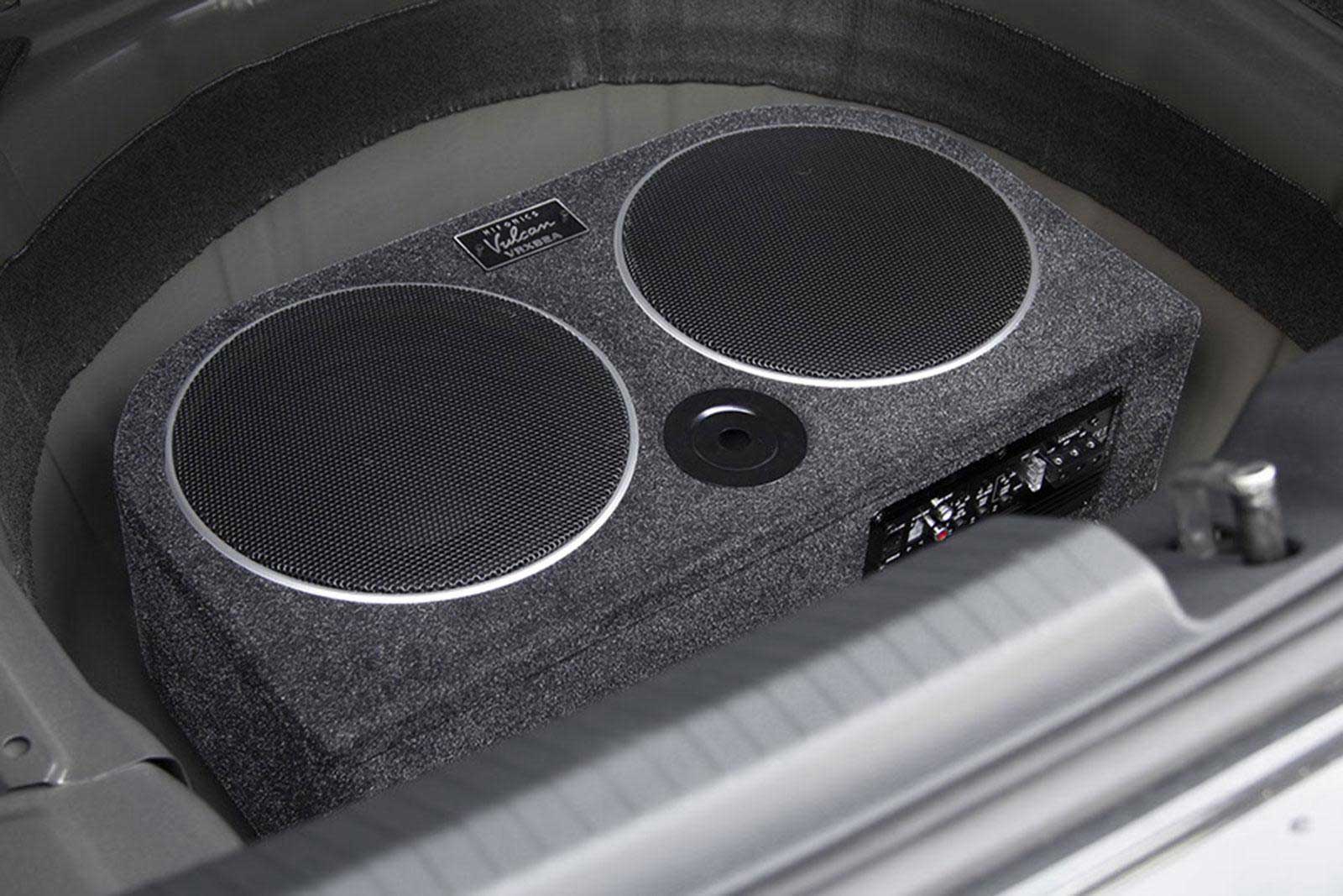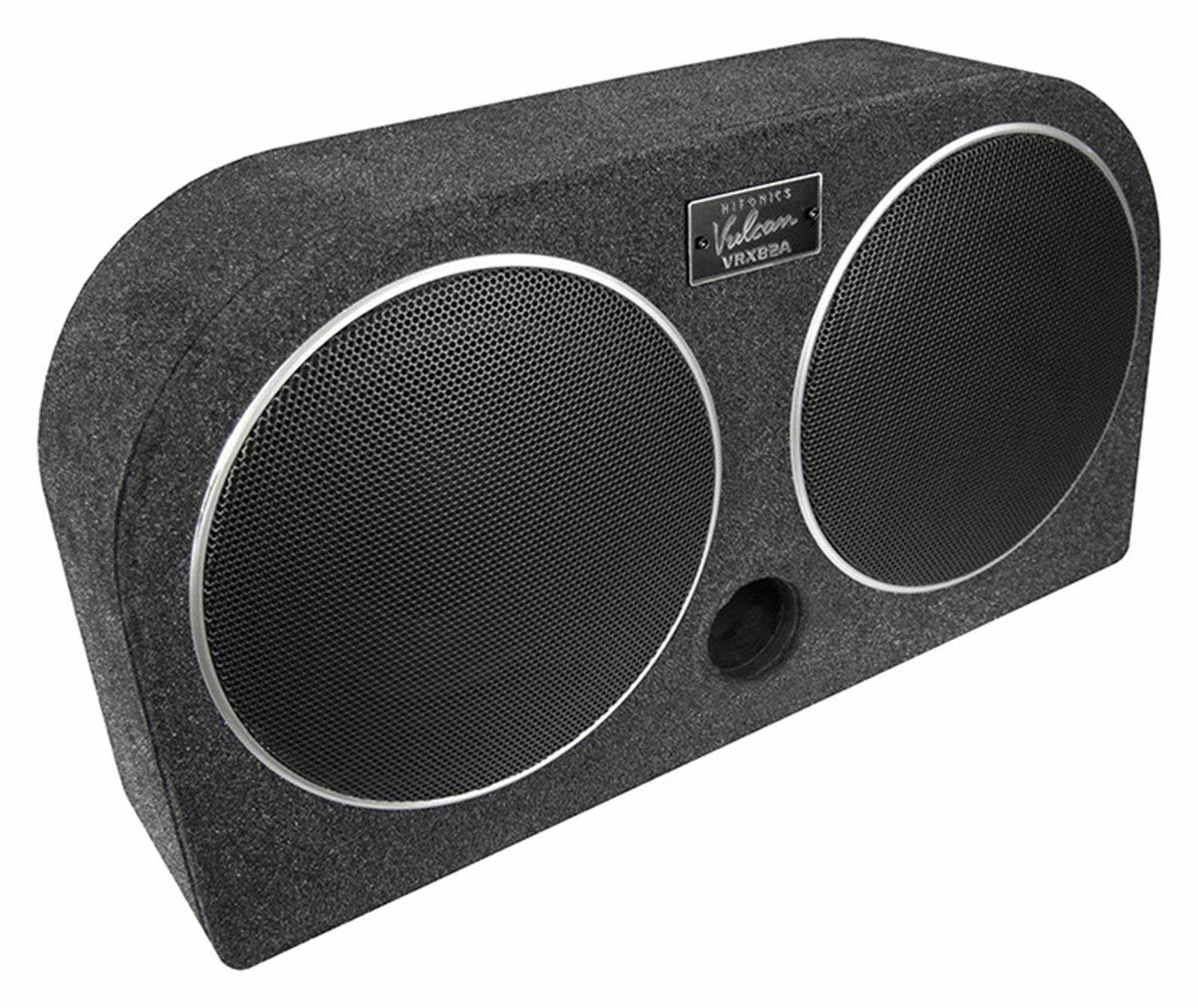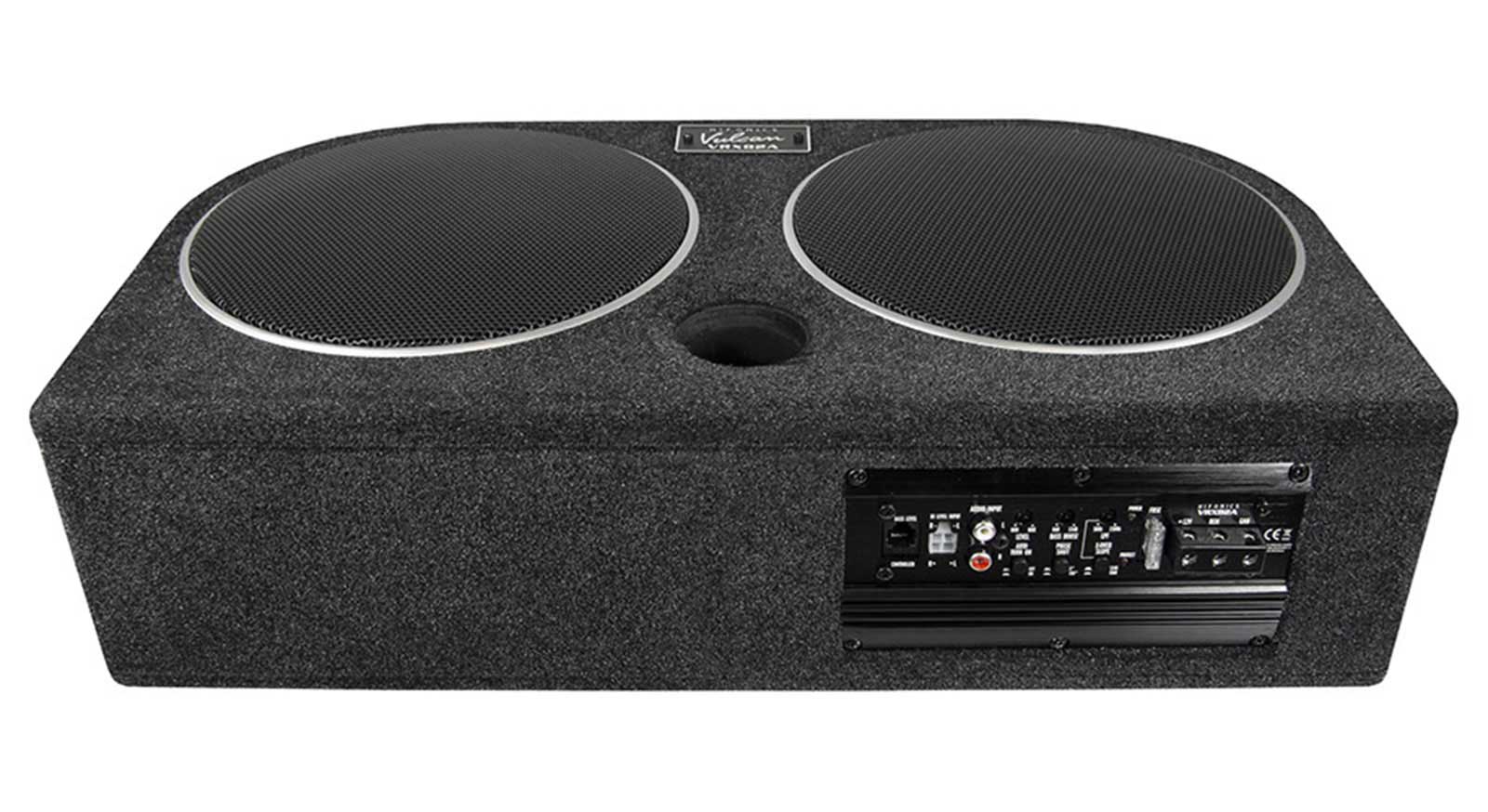 Die flache, hinten abgerundete Gehäuseform des neuen VULCAN VRX82A Aktivsystems ermöglicht die Installation in der Reserveradmulde oder auch aufrecht stehend, indem die mitgelieferten Gummifüße unten am Gehäuse montiert werden. Der Clou des neuen VULCAN Systems ist die quasi mitschwingende Passiv-Membran, die neben dem aktiv angetriebenen Tieftöner für die zusätzliche und für tiefe Frequenzen wichtige Luftverdrängung sorgt. Die VRX82A ist hier im Vorteil, denn herkömmliche Bassreflexgehäuse neigen dazu, Strömungsgeräusche am Reflexport zu erzeugen, welcher auch noch wertvolles Innenvolumen wegnimmt. Nicht so bei den Systemen mit Passiv-Strahler, welcher hierbei wie ein Bassreflexkanal fungiert - nur eben ohne lästige Störgeräusche. Ein integrierter, mit über 80% Wirkungsgrad arbeitender Class-D Amp sorgt für hohe 200 Watt RMS und liefert dem Subwoofer effiziente Digitalpower.