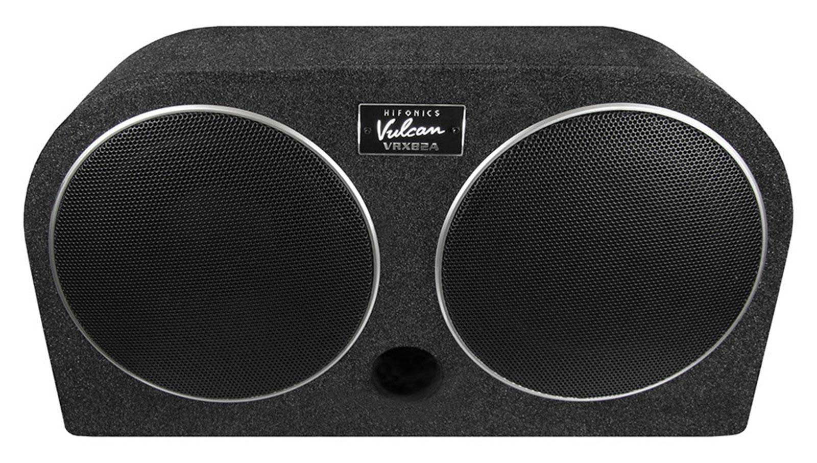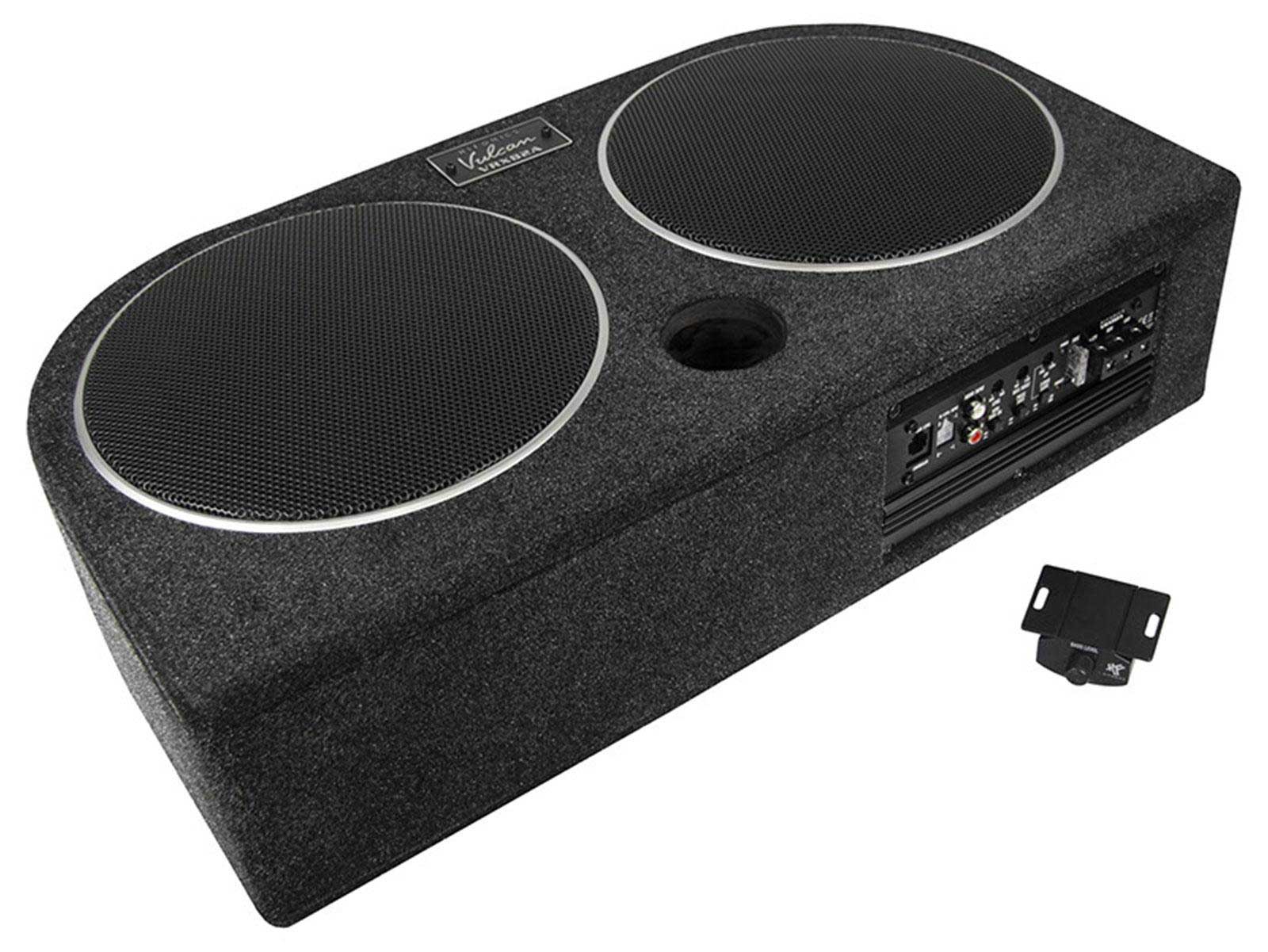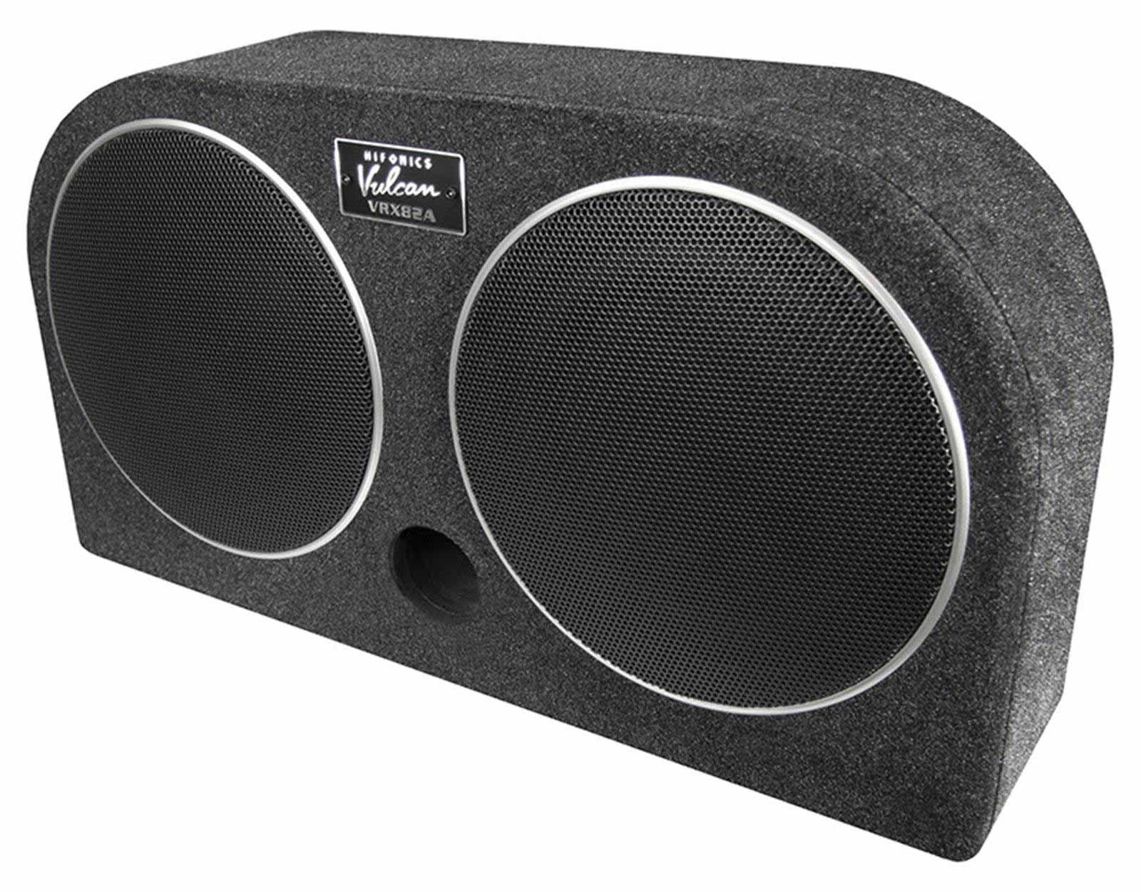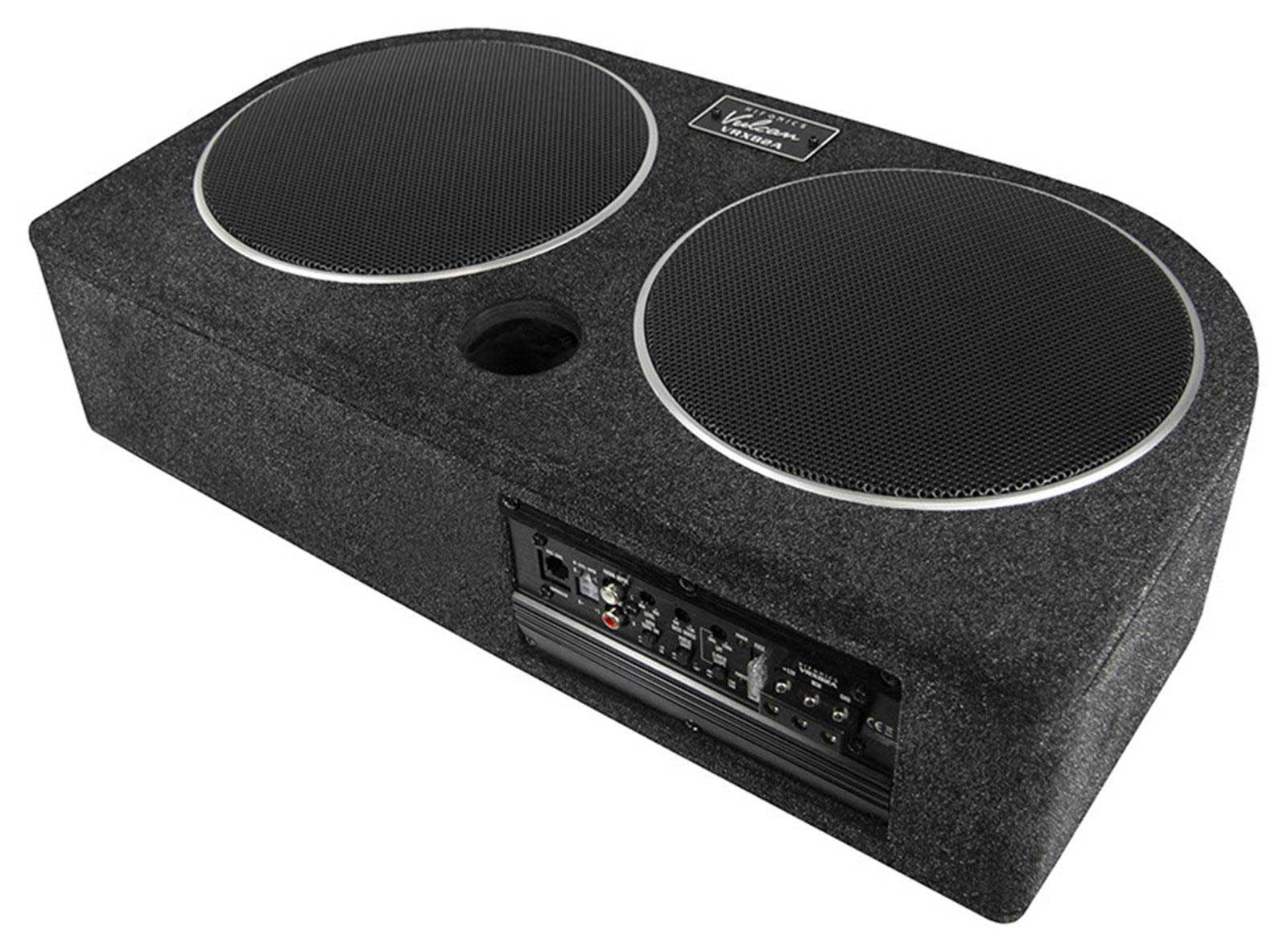 Die flache, hinten abgerundete Gehäuseform des neuen VULCAN VRX82A Aktivsystems ermöglicht die Installation in der Reserveradmulde oder auch aufrecht stehend, indem die mitgelieferten Gummifüße unten am Gehäuse montiert werden. Der Clou des neuen VULCAN Systems ist die quasi mitschwingende Passiv-Membran, die neben dem aktiv angetriebenen Tieftöner für die zusätzliche und für tiefe Frequenzen wichtige Luftverdrängung sorgt. Die VRX82A ist hier im Vorteil, denn herkömmliche Bassreflexgehäuse neigen dazu, Strömungsgeräusche am Reflexport zu erzeugen, welcher auch noch wertvolles Innenvolumen wegnimmt. Nicht so bei den Systemen mit Passiv-Strahler, welcher hierbei wie ein Bassreflexkanal fungiert - nur eben ohne lästige Störgeräusche. Ein integrierter, mit über 80% Wirkungsgrad arbeitender Class-D Amp sorgt für hohe 200 Watt RMS und liefert dem Subwoofer effiziente Digitalpower.