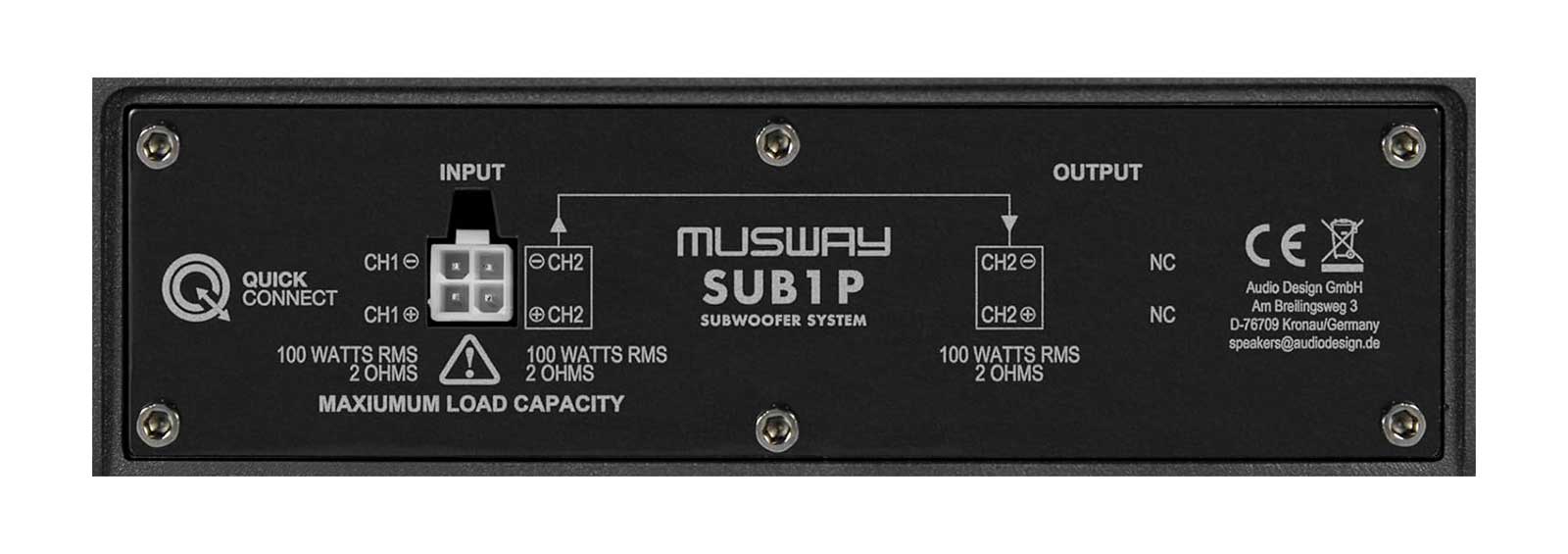 Der SUB1P hat eine Impedanz von 2 Ohm. Wird nun beispielsweise ein Musway M6 Verstärker mit dem beiliegenden Quick Connect Kabel verkabelt, wird zunächst nur Kanal 5 der Endstufe benutzt. Wird ein weiterer SUB1P in Betrieb genommen, wird dieser über das mitgelieferte QC-Kabel am Ausgang des ersten SUB1P angeschlossen. Der zweite SUB1P wird dann wie von Zauberhand vom Verstärkerkanal 6 der Endstufe angetrieben - dank der vorkonfektionierten Plug+Play Kabel.