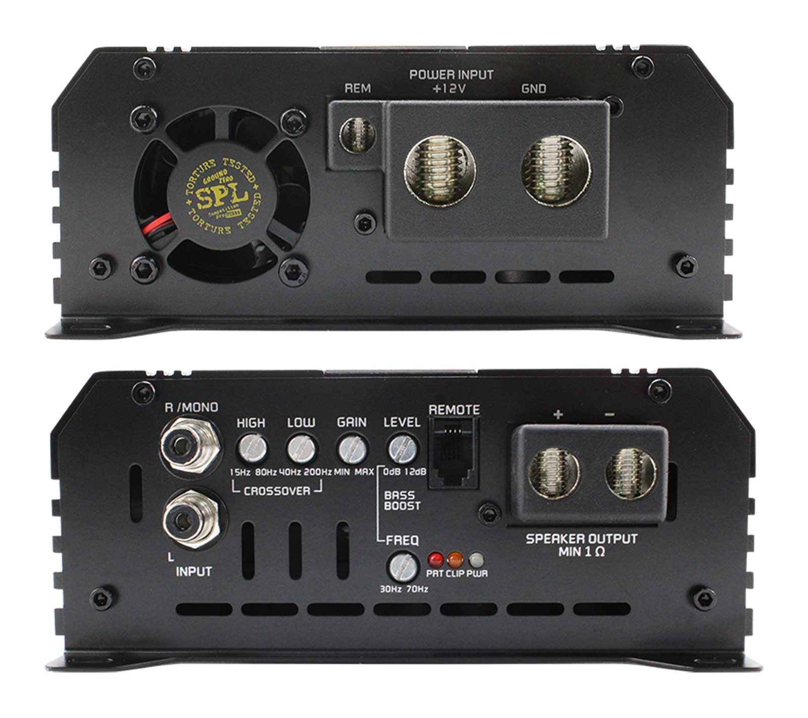 1-Kanal 1-Ohm stabiler SPL-Hochleistungsverstärker mit Class D Schaltung, integrierter Aktivweiche und Bass Boost