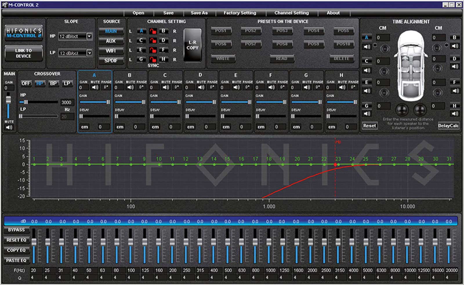 Die M-CONTROL 2 Software bietet eine Vielzahl von Möglichkeiten Ihr Soundsystem an die Fahrzeugakustik anzupassen. Eine übersichtliche und logisch aufgebaute Bedienoberfläche ermöglicht eine intuitive Handhabung und eine Abstimmung des Sounds in Echtzeit, während das DSP-Gerät per USB mit der Software verbunden ist. Alle 8 Kanäle können einzeln oder als 4 Kanalpaare konfiguriert werden. Neben den Frequenzweichenfiltern Hochpass, Tiefpass und Bandpass können auch Parameter wie Phasendrehung und Laufzeitkorrektur samt einem 31-Band Equalizer pro Kanal eingestellt werden. Bis zu 10 verschiedene Konfigurationen können dann auf dem DSP-Gerät gespeichert werden.