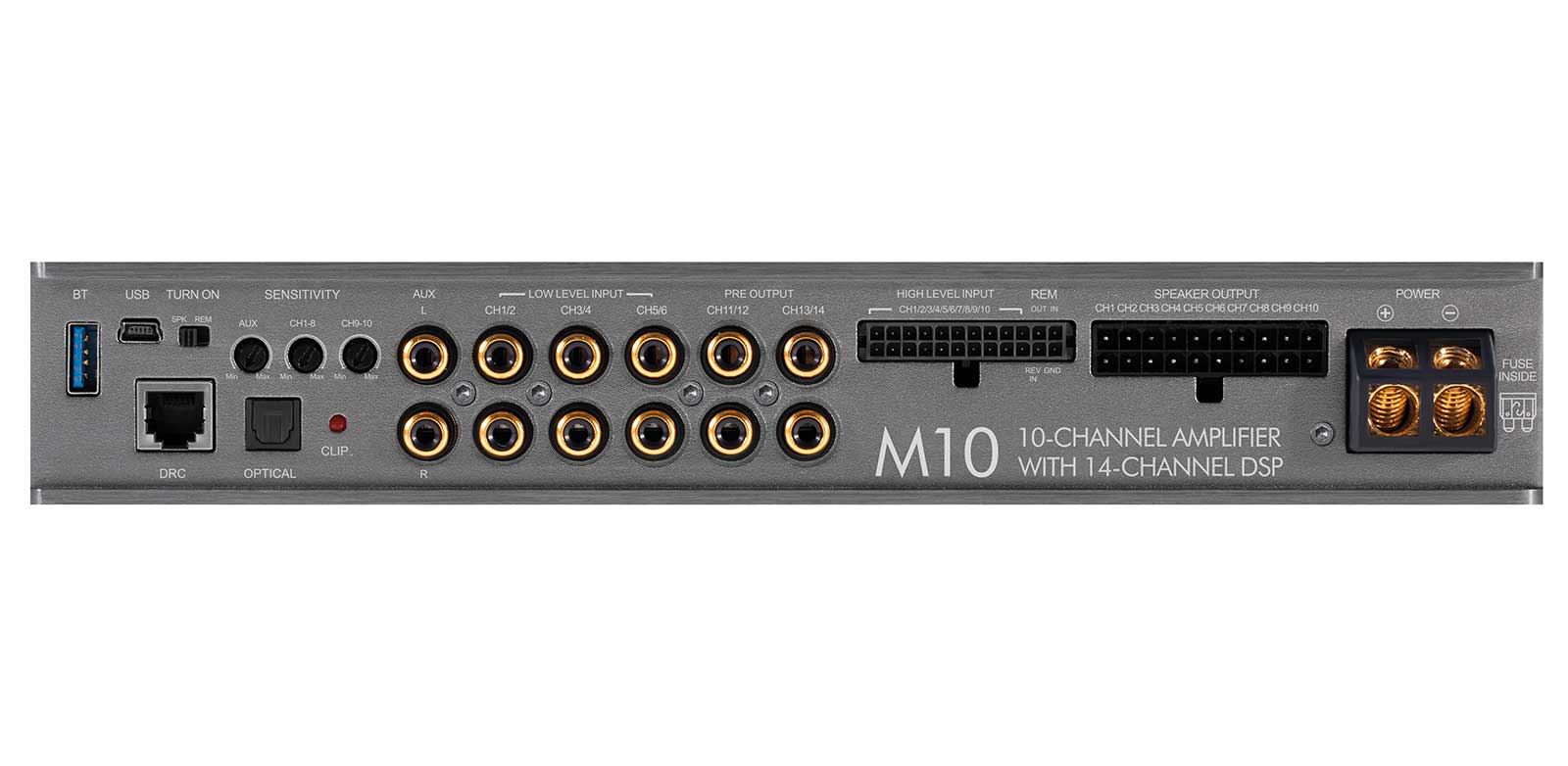 Der neue Musway M10 Verstärker beeindruckt mit einer Ausstattung von 10 Class-D Kanälen sowie einem integrierten 14-Kanal DSP mit 4 Ausgängen. Er richtet sich besonders an HiFi-Enthusiasten, die komplexere Car-Hifi Lautsprechersysteme ohne aufwendige Verkabelungen realisieren wollen. Speziell für aktuelle BMW- und Mercedes Modelle, bei denen kräftige Untersitz- oder Fußraum-Subwoofer angetrieben werden müssen, eignet sich der M10 mit seinen beiden leistungsstarken Subwoofer-Kanälen hervorragend.
