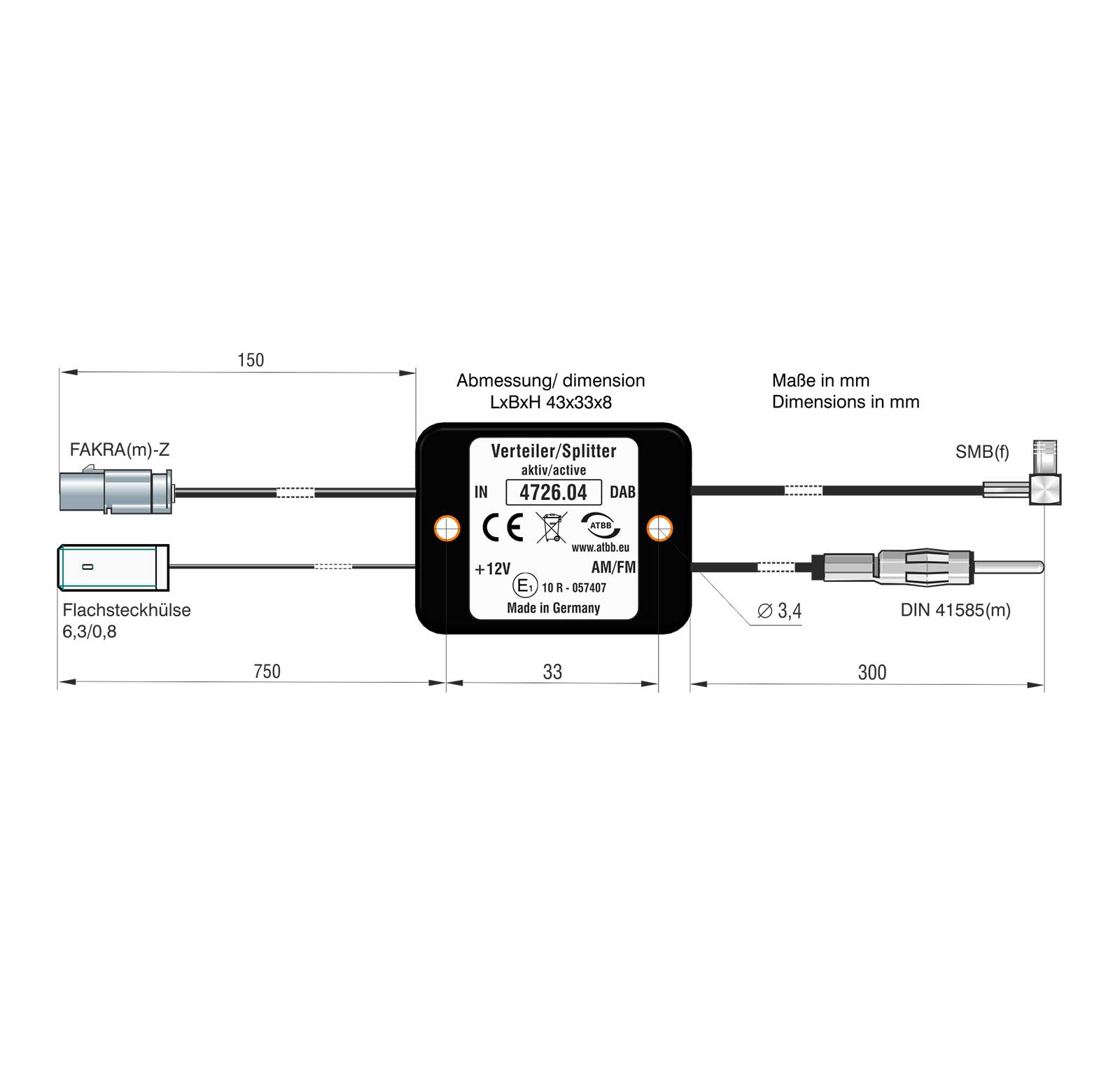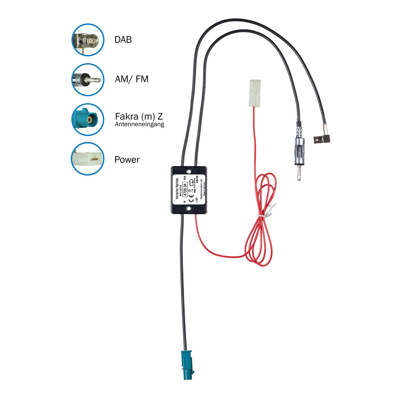 Die besten Ergebnisse werden erzielt, wenn der Splitter mit einer passiven Antenne FM/UKW/DAB kombiniert wird: 16 V Antenne 143-ABB_2116_01, Flexantenne mit verstellbarem Stab von 10-115 Grad 143-ABB_3940_01, Shark/Haifischantenne 143-ABB_3759_01.