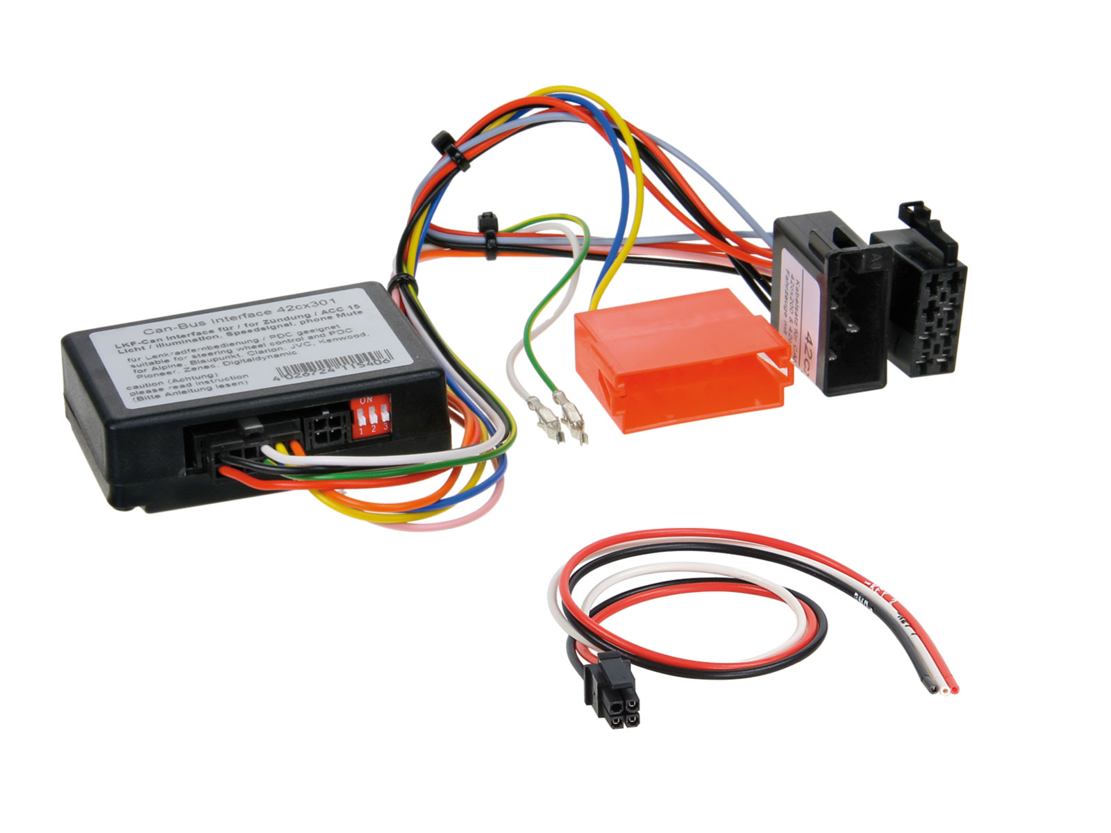 Lieferumfang: Lenkradfernbedienungsinterface, Anschlußkabel (KFZ auf ISO), Kabel zum Anschluß ans Nachrüst-Radio (Remote in), Einbauanleitung