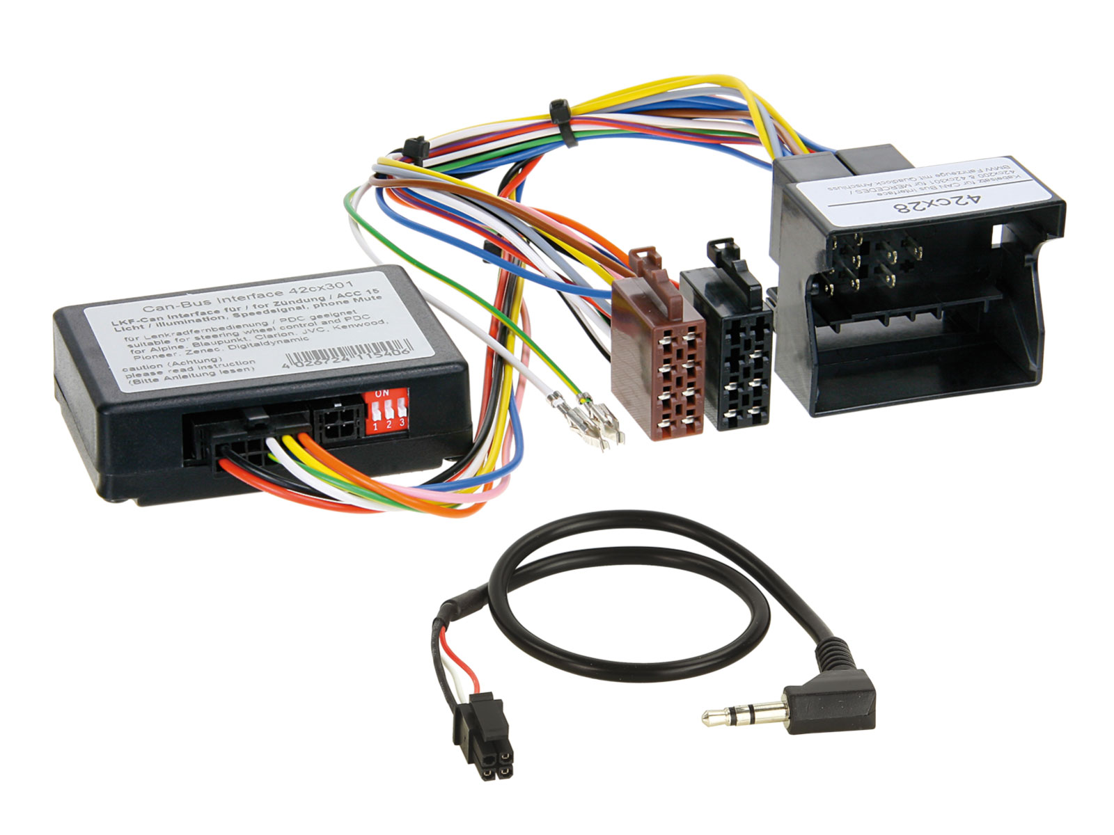 Lieferumfang: Lenkradfernbedienungsinterface, Anschlußkabel (KFZ auf ISO), Kabel zum Anschluß ans Nachrüst-Radio (Remote in), Einbauanleitung