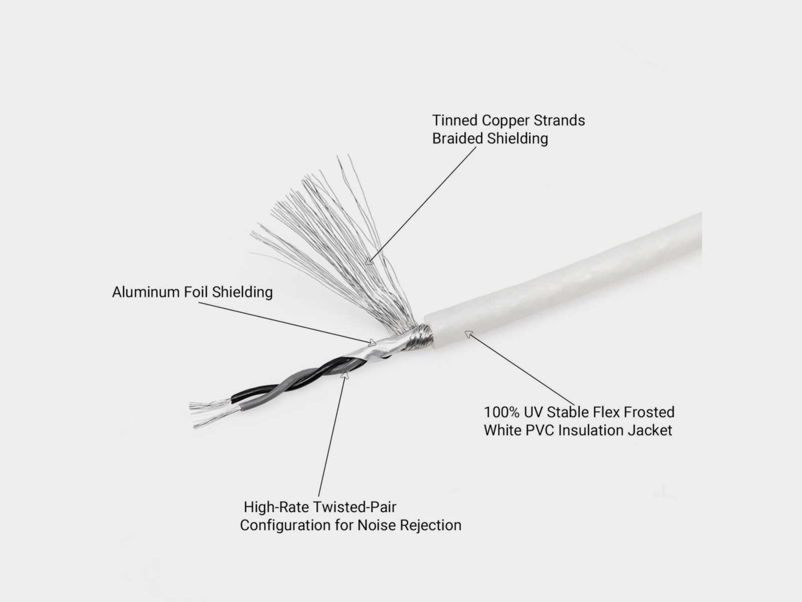 Dreifach abgeschirmt für Rauschunterdrückung und maximale Signalübertragung, einschließlich Hochgeschwindigkeits-Twisted-Pair-Konfiguration, Aluminiumfolie und geflochtenem, verzinntem Kupferschild.