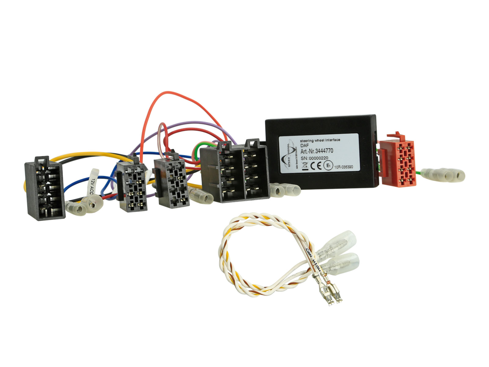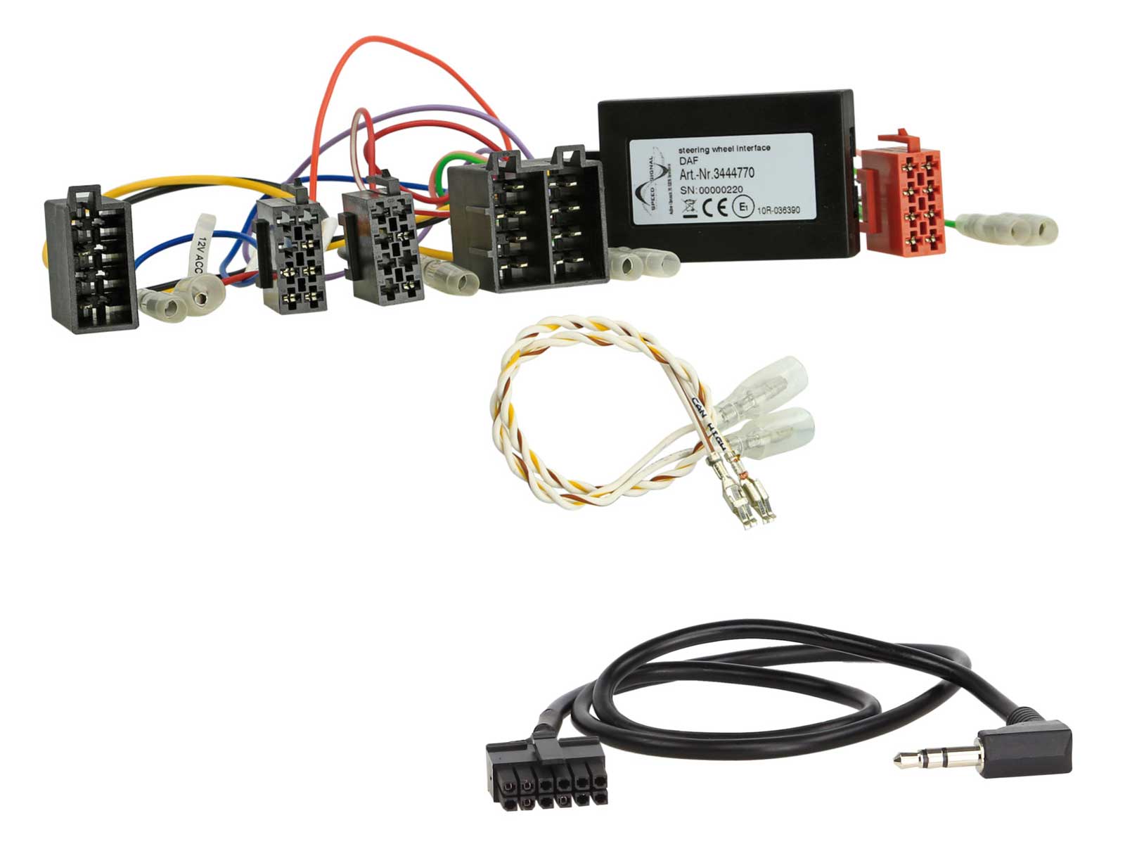 Lieferumfang: Lenkradfernbedienungsinterface, Anschlußkabel (KFZ auf ISO), Kabel zum Anschluß ans Nachrüst-Radio (Remote in), Einbauanleitung