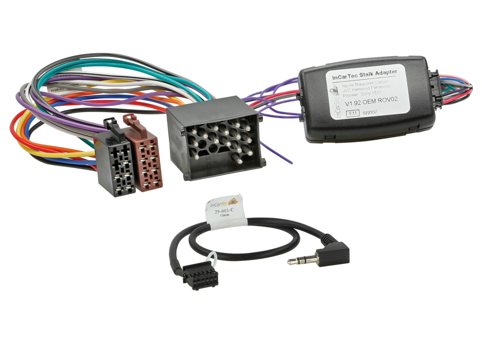 Lieferumfang: Lenkradfernbedienungsinterface, Anschlusskabel (KFZ auf ISO), Kabel zum Anschluß ans Nachrüst-Radio (Remote in), Einbauanleitung
