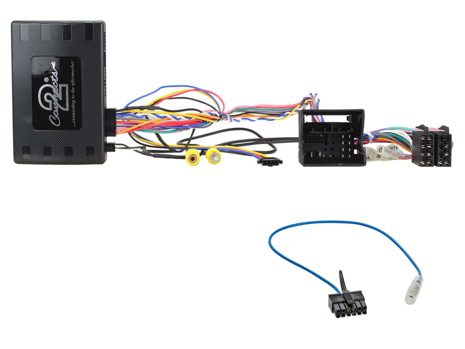 Schnittstelle zur Beibehaltung von Fahrzeugmenüs, Lenkradsteuerungen, Telefontasten usw. beim Einbau eines Nachrüstradios. Bietet einen optionalen Eingang für eine Rückfahrkamera und Ausgänge für Parkbremse, Geschwindigkeitsimpuls, Rückwärtsgang und Stummschaltung