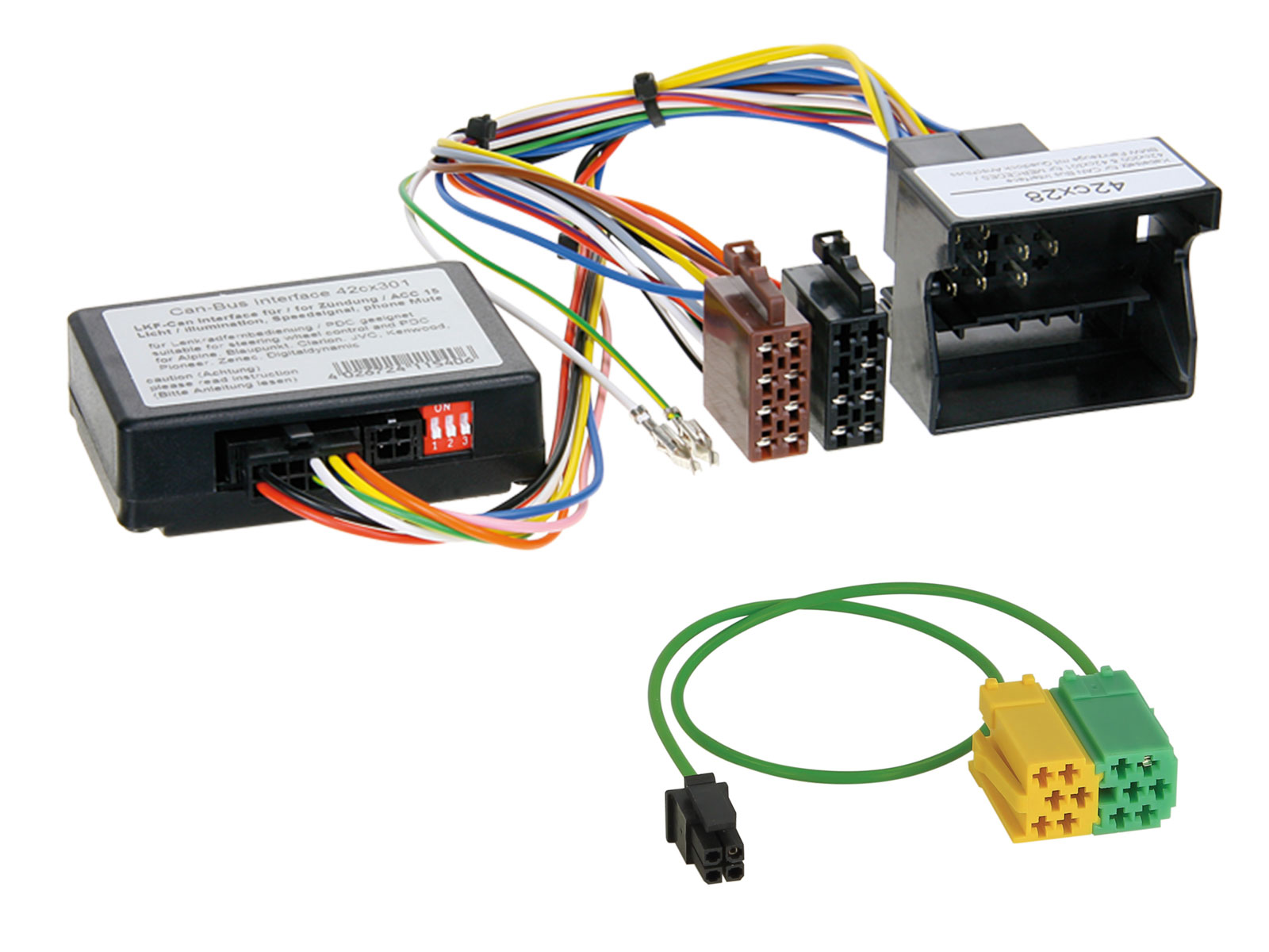 Lieferumfang: Lenkradfernbedienungsinterface, Anschlußkabel (KFZ auf ISO), Kabel zum Anschluß ans Nachrüst-Radio (Remote in), Einbauanleitung