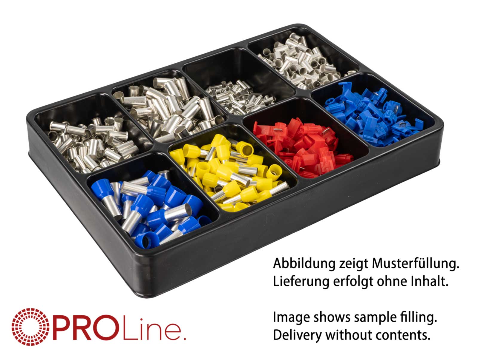 Sortiereinlage mit fester Einteilung für Ordnung in der Werkstatt und am Arbeitsplatz und zur übersichtlichen Sortierung von Kleinteilen wie Flachstecker, Rundstecker und Hülsen, Stoßverbinder, Sicherungen und andere Kleinteile.